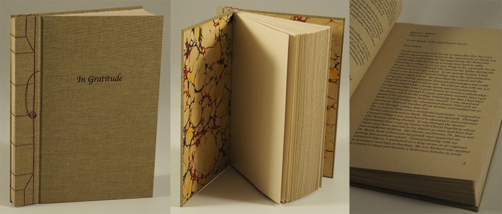 Handmade book for the family of Joan Kuyper Farver containing over 45 letters written by current and former students expressing their gratitude for receiving a Rolscreen scholarship. Joan Kuyper Farver established the scholarship in the 1960’s and her family continues to fund it to this day. The book was commissioned by Central College and given to the Kuyper Farver family. It was created in the art studios at Central College, printed digitally on Nideggen paper and hand stitched by Mathew R. Kelly.